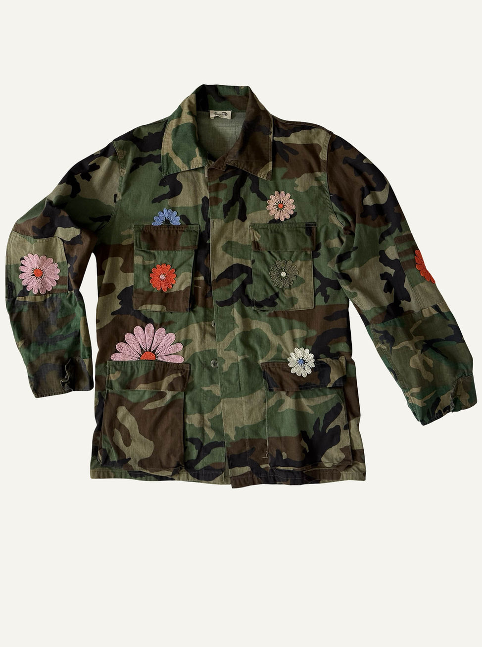An authentic vintage camouflage field layer, originally designed for durability and function, is reimagined with the Jumeaux ethos where toughness meets optimism. Each bloom is hand beaded, carrying subtle variation that reflects the artisan's hand. The florals interrupt the camouflage with intention, introducing brightness to a traditionally rugged canvas.